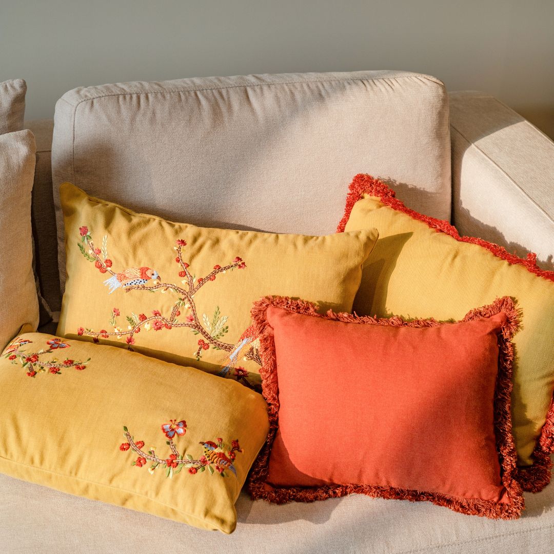 Introducing Bird of Paradise Hand-Embroidered Cushion, a stunning piece that brings the allure of nature into your living space. This exquisite cushion showcases the timeless beauty of nature's most vibrant and enchanting bird, the Bird of Paradise, meticulously hand-embroidered onto a luxurious fabric.