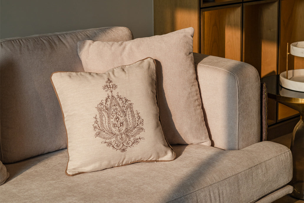 The "Frozen Majesty Dori Cushion" stands as a tribute to the splendor of nature's frozen creations, while also exuding an air of regal splendor. The design gracefully balances the ethereal delicacy of frost with the grandeur of royalty. Each stitch is a testament to skilled craftsmanship, and each thread is woven with care, culminating in a piece that's not just a cushion, but a work of art.