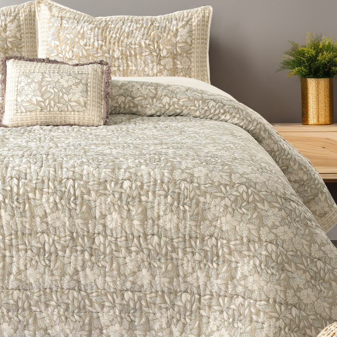 Wrap yourself in comfort with our Block Printed Pure Mulmul Cotton Quilt. Handcrafted with care, this lightweight yet cozy quilt features intricate block prints on the softest cotton, making it a perfect blend of traditional artistry and modern luxury for your home.